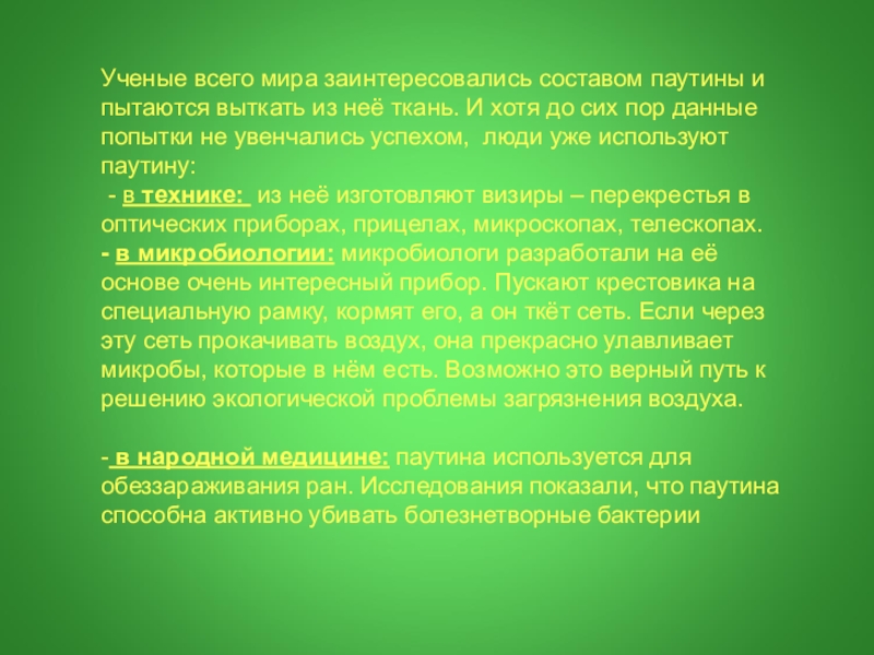 Слайд 29Ученые всего мира заинтересовались составом паутины и пытаются выткать из неё