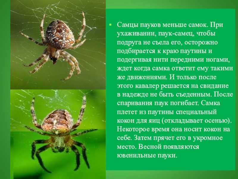 Самцы пауков меньше самок. При ухаживании, паук-самец, чтобы подруга не съела