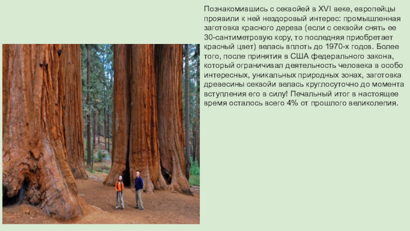 Слайд 5Познакомившись с секвойей в XVI веке, европейцы проявили к ней нездоровый