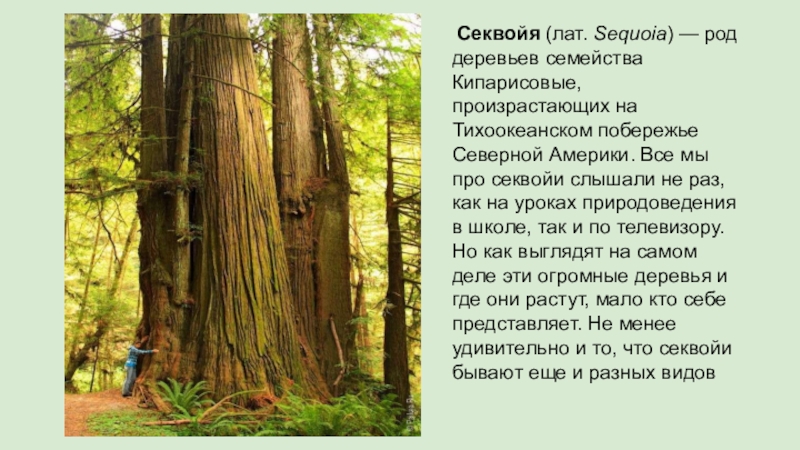 Слайд 6 Секвойя (лат. Sequoia) — род деревьев семейства Кипарисовые, произрастающих на