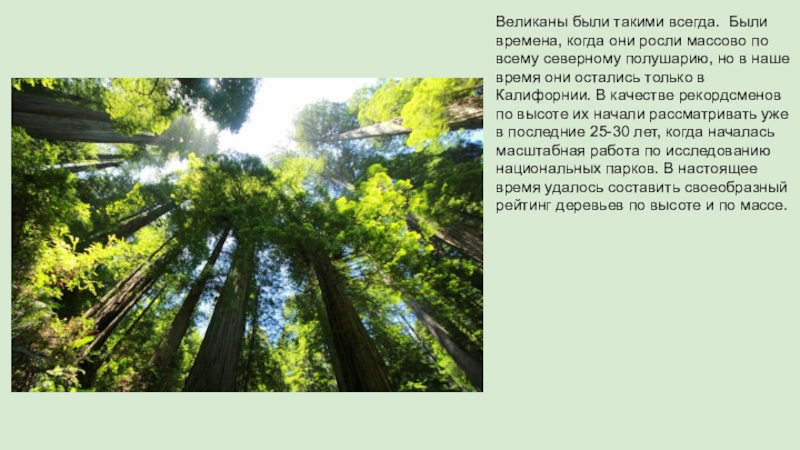 всему северному полушарию, но в наше время они остались только в Калифорнии. В качестве рекордсменов по высоте их начали рассматривать уже в последние 25-30 лет, когда началась масштабная работа по исследованию национальных парков. В настоящее время удалось составить своеобразный рейтинг деревьев по высоте и по массе.