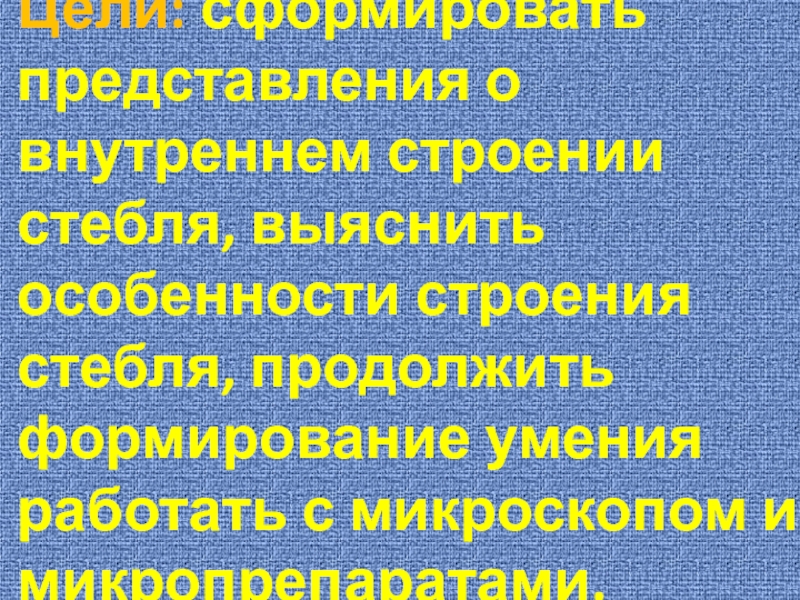 Слайд 2Цели: сформировать представления о внутреннем строении стебля, выяснить особенности строения стебля,