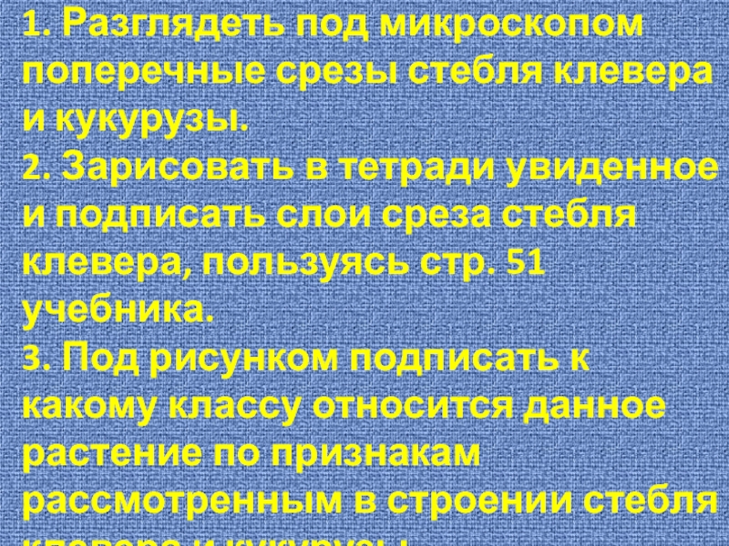 Зарисовать в тетради увиденное и подписать слои среза стебля клевера, пользуясь стр. 51 учебника. 3. Под рисунком подписать к какому классу относится данное растение по признакам рассмотренным в строении стебля клевера и кукурузы.