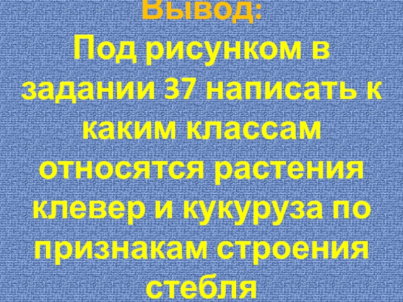 Вывод: Под рисунком в задании 37 написать к каким классам относятся растения клевер и кукуруза по признакам