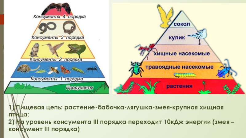 бабочка, змея, лягушка. Сколько энергии переходит на уровень консументов III порядка, если чистая годовая первичная продукция экосистемы составляет 10000кДЖ?