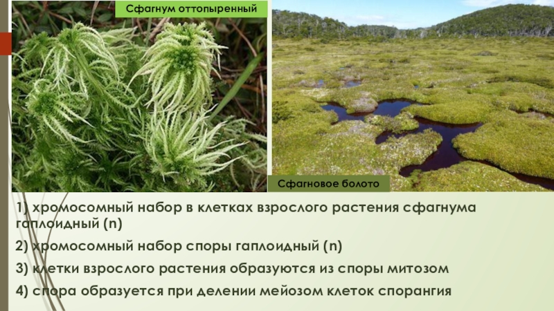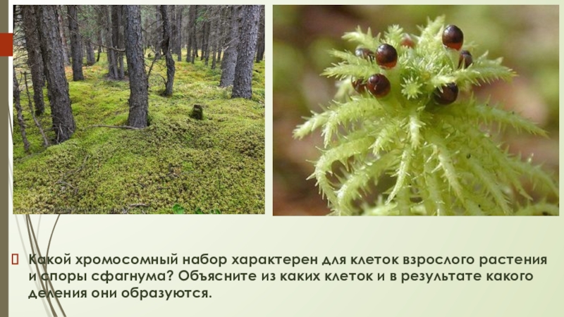 Слайд 37Какой хромосомный набор характерен для клеток взрослого растения и споры сфагнума?