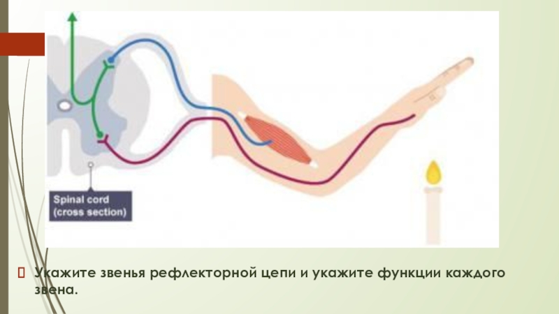 Слайд 33Укажите звенья рефлекторной цепи и укажите функции каждого звена.