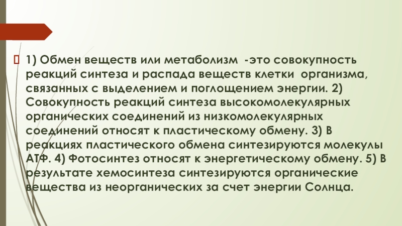 Слайд 321) Обмен веществ или метаболизм -это совокупность реакций синтеза и распада