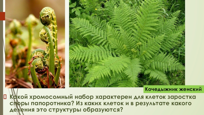 Слайд 7Какой хромосомный набор характерен для клеток заростка споры папоротника? Из каких