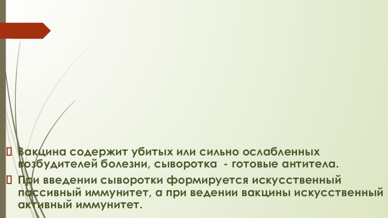 Слайд 10Вакцина содержит убитых или сильно ослабленных возбудителей болезни, сыворотка - готовые
