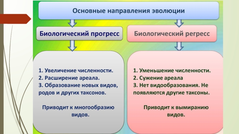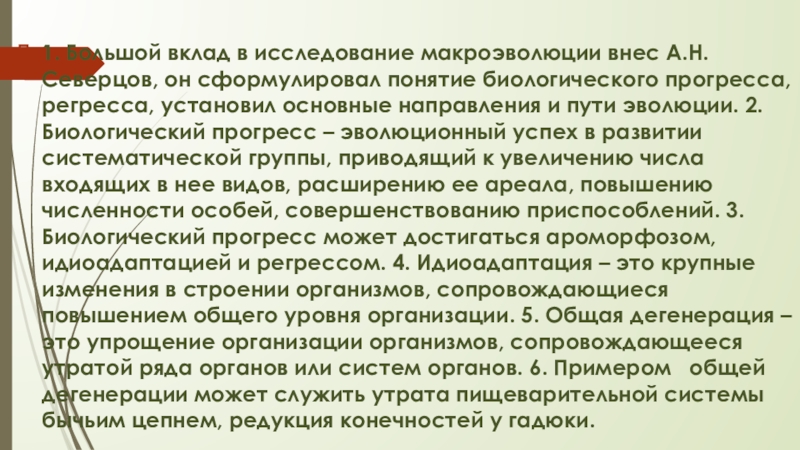 биологического прогресса, регресса, установил основные направления и пути эволюции. 2. Биологический прогресс – эволюционный успех в развитии систематической группы, приводящий к увеличению числа входящих в нее видов, расширению ее ареала, повышению численности особей, совершенствованию приспособлений. 3. Биологический прогресс может достигаться ароморфозом, идиоадаптацией и регрессом. 4. Идиоадаптация – это крупные изменения в строении организмов, сопровождающиеся повышением общего уровня организации. 5. Общая дегенерация – это упрощение организации организмов, сопровождающееся утратой ряда органов или систем органов. 6. Примером общей дегенерации может служить утрата пищеварительной системы бычьим цепнем, редукция конечностей у гадюки.