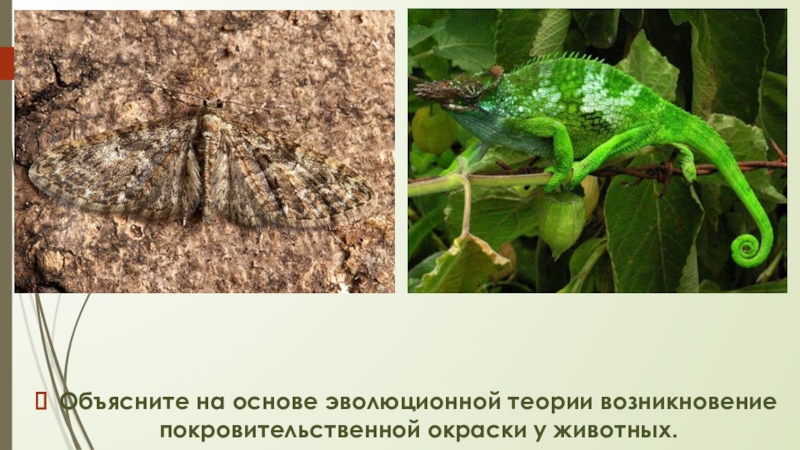 Слайд 17Объясните на основе эволюционной теории возникновение покровительственной окраски у животных.