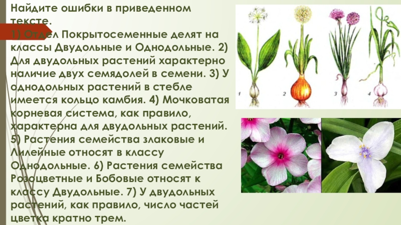 и Однодольные. 2) Для двудольных растений характерно наличие двух семядолей в семени. 3) У однодольных растений в стебле имеется кольцо камбия. 4) Мочковатая корневая система, как правило, характерна для двудольных растений. 5) Растения семейства злаковые и Лилейные относят в классу Однодольные. 6) Растения семейства Розоцветные и Бобовые относят к классу Двудольные. 7) У двудольных растений, как правило, число частей цветка кратно трем.