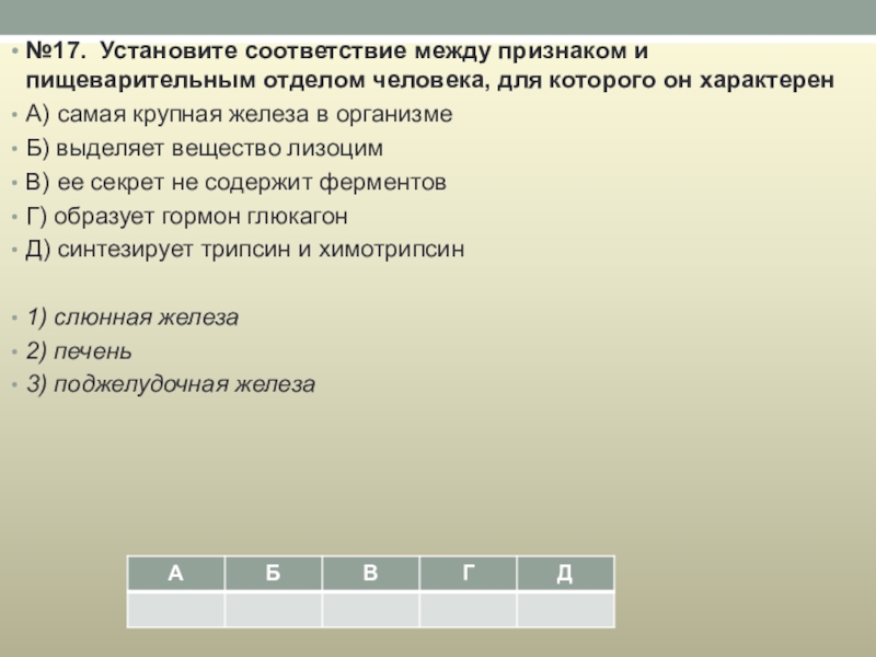 Слайд 55№17. Установите соответствие между признаком и пищеварительным отделом человека, для которого