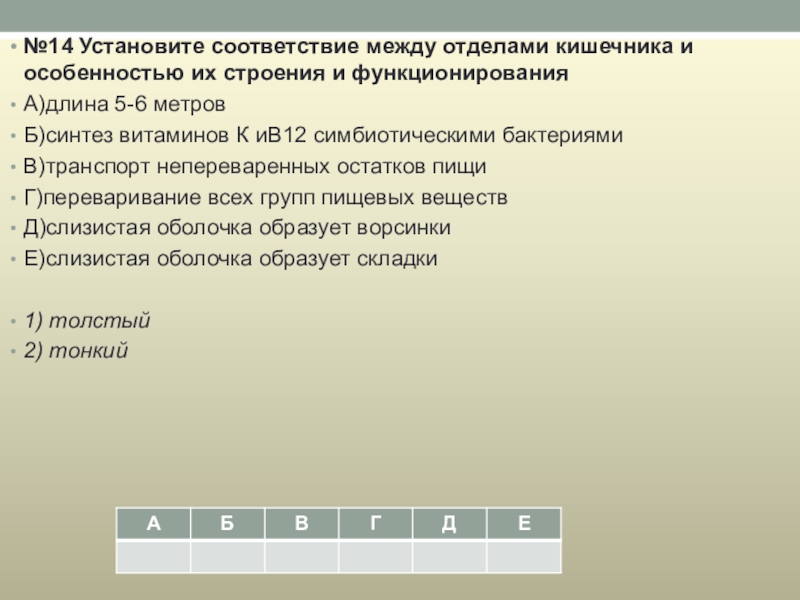Слайд 53№14 Установите соответствие между отделами кишечника и особенностью их строения и