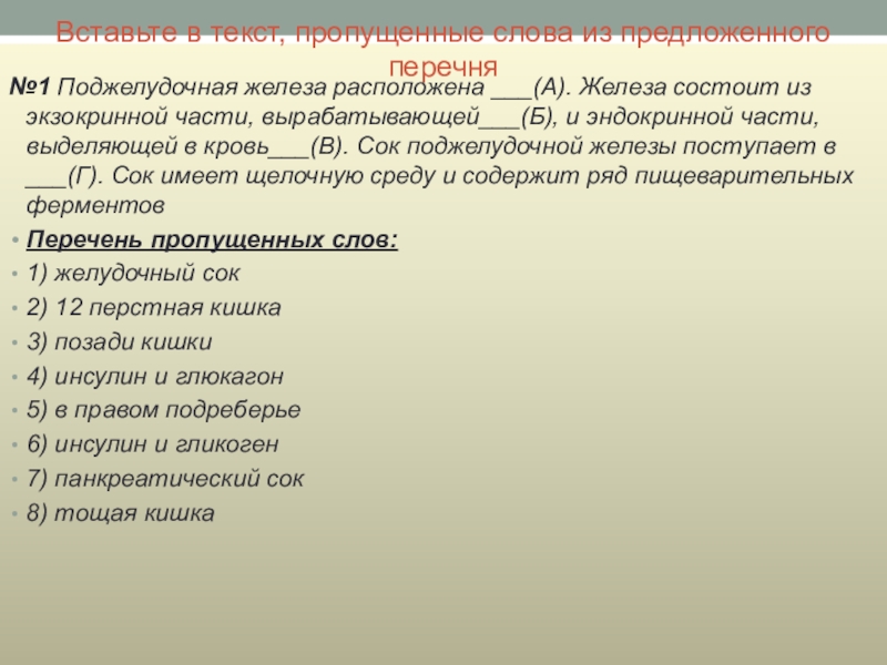 ___(А). Железа состоит из экзокринной части, вырабатывающей___(Б), и эндокринной части, выделяющей в кровь___(В). Сок поджелудочной железы поступает в ___(Г). Сок имеет щелочную среду и содержит ряд пищеварительных ферментов