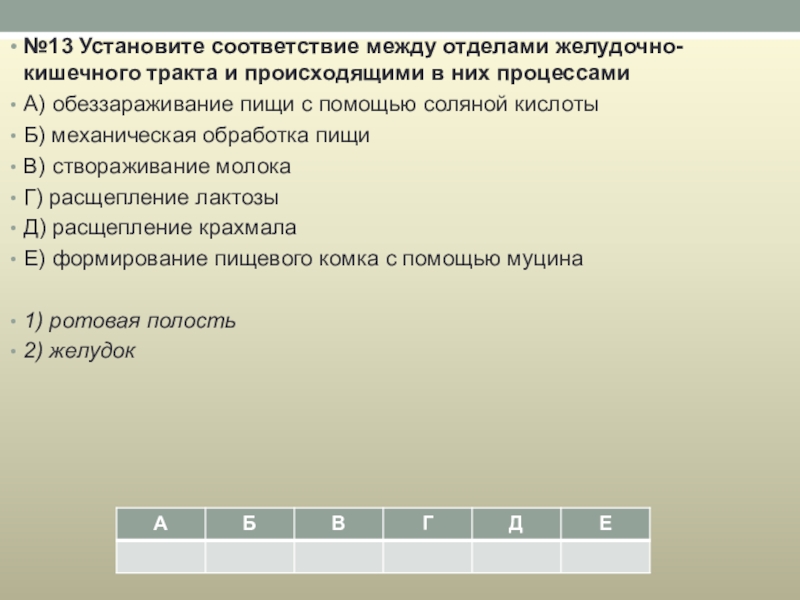 Слайд 52№13 Установите соответствие между отделами желудочно- кишечного тракта и происходящими в