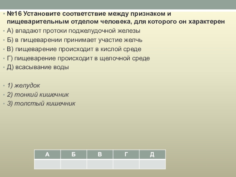 Слайд 54№16 Установите соответствие между признаком и пищеварительным отделом человека, для которого