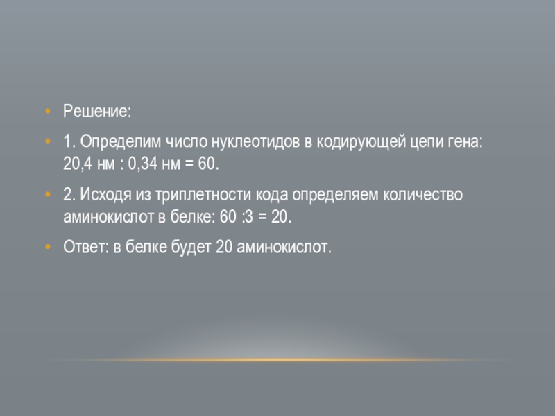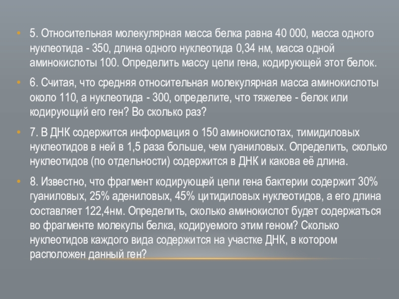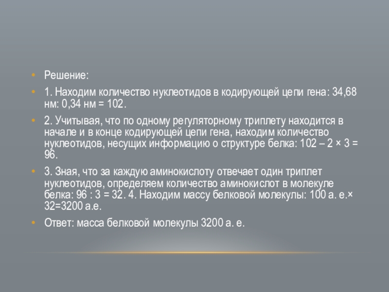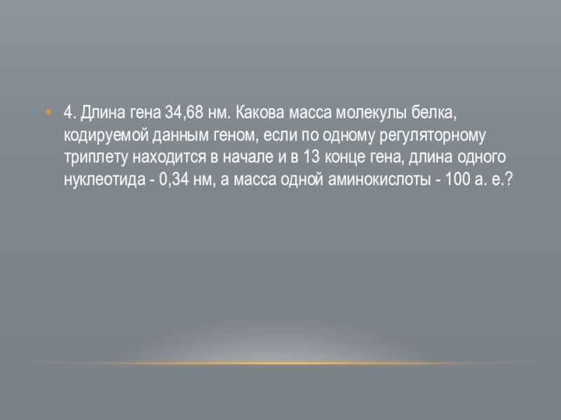 Слайд 234. Длина гена 34,68 нм. Какова масса молекулы белка, кодируемой данным