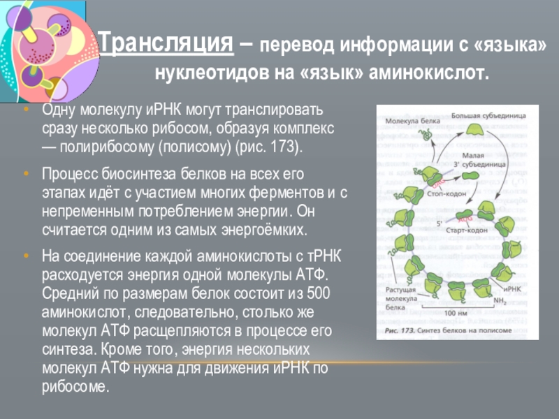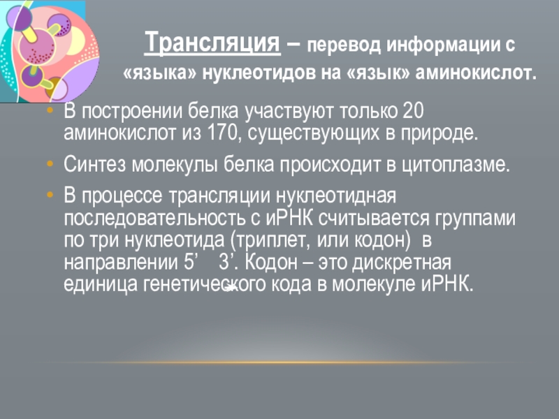 Слайд 10Трансляция – перевод информации с «языка» нуклеотидов на «язык» аминокислот.