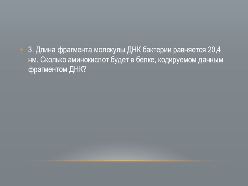 Слайд 213. Длина фрагмента молекулы ДНК бактерии равняется 20,4 нм. Сколько аминокислот