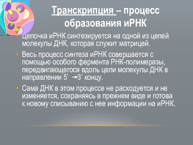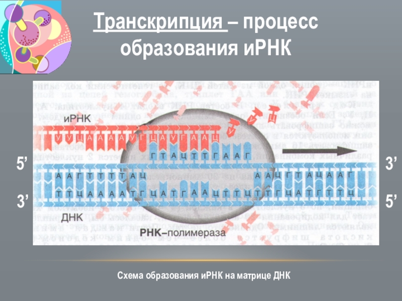 Весь процесс синтеза иРНК совершается с помощью особого фермента РНК-полимеразы, передвигающегося вдоль цепи молекулы ДНК в направлении 5’ 3’ концу.