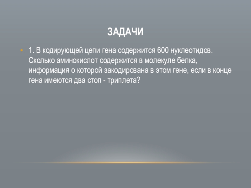 1. В кодирующей цепи гена содержится 600 нуклеотидов. Сколько аминокислот содержится