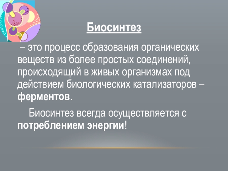 Процесс биосинтеза белков на всех его этапах идёт с участием многих ферментов и с непременным потреблением энергии. Он считается одним из самых энергоёмких.