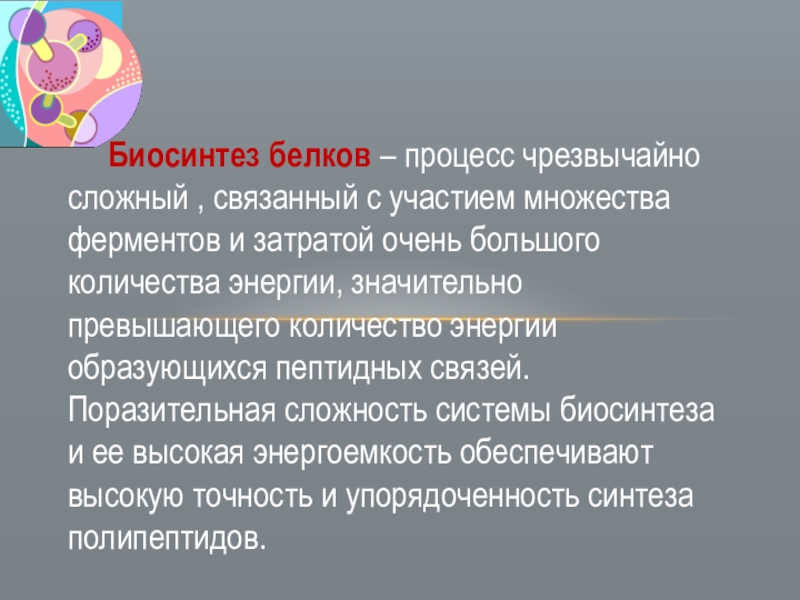 ферментов и затратой очень большого количества энергии, значительно превышающего количество энергии образующихся пептидных связей. Поразительная сложность системы биосинтеза и ее высокая энергоемкость обеспечивают высокую точность и упорядоченность синтеза полипептидов.