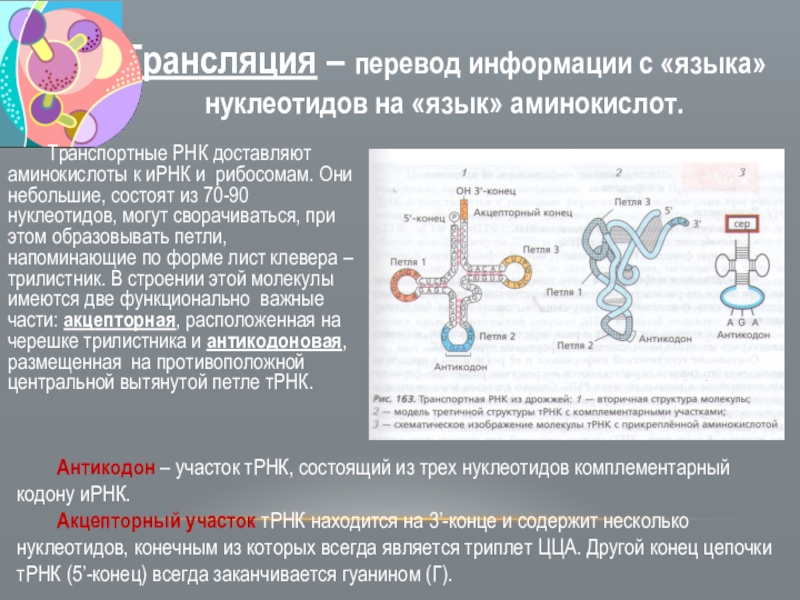 доставляют аминокислоты к иРНК и рибосомам. Они небольшие, состоят из 70-90 нуклеотидов, могут сворачиваться, при этом образовывать петли, напоминающие по форме лист клевера – трилистник. В строении этой молекулы имеются две функционально важные части: акцепторная, расположенная на черешке трилистника и антикодоновая, размещенная на противоположной центральной вытянутой петле тРНК.