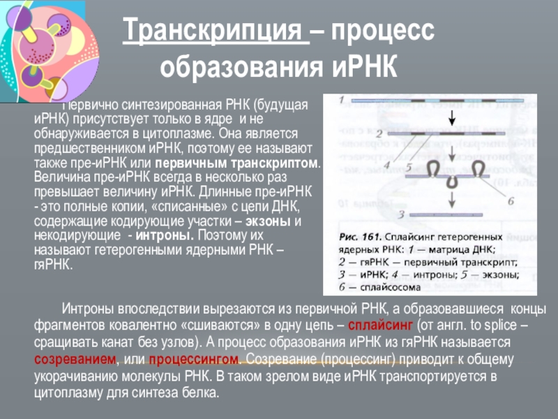 в ядре и не обнаруживается в цитоплазме. Она является предшественником иРНК, поэтому ее называют также пре-иРНК или первичным транскриптом. Величина пре-иРНК всегда в несколько раз превышает величину иРНК. Длинные пре-иРНК - это полные копии, «списанные» с цепи ДНК, содержащие кодирующие участки – экзоны и некодирующие - интроны. Поэтому их называют гетерогенными ядерными РНК –гяРНК.