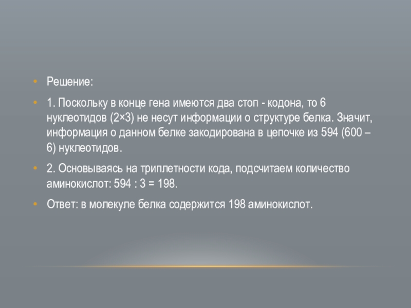 то 6 нуклеотидов (2×3) не несут информации о структуре белка. Значит, информация о данном белке закодирована в цепочке из 594 (600 – 6) нуклеотидов.