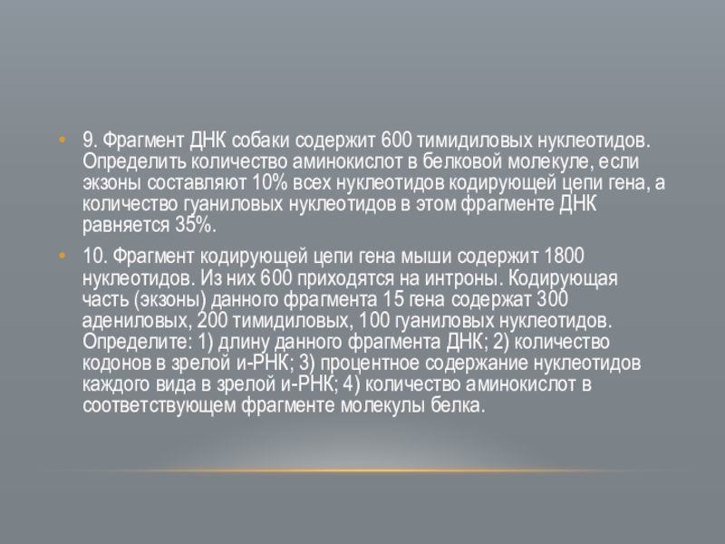 Слайд 269. Фрагмент ДНК собаки содержит 600 тимидиловых нуклеотидов. Определить количество аминокислот