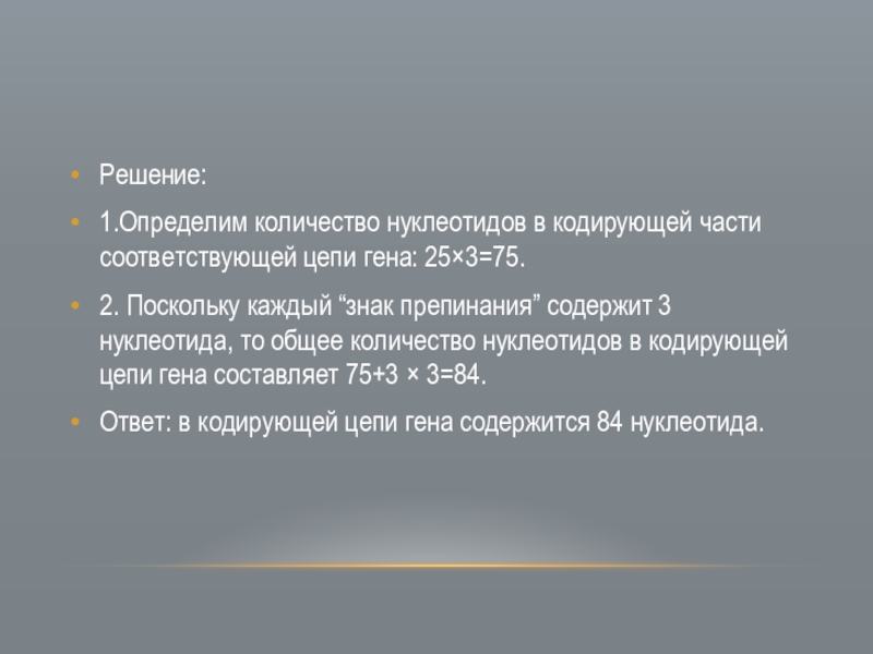 2. Поскольку каждый “знак препинания” содержит 3 нуклеотида, то общее количество нуклеотидов в кодирующей цепи гена составляет 75+3 × 3=84.