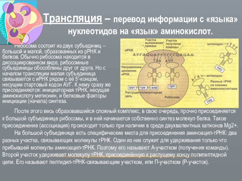 Рибосома состоит из двух субъединиц – большой и малой, образованных из рРНК и белков. Обычно рибосома находится в диссоциированном виде, рибосомные субъединицы обособлены друг от друга. Но с началом трансляции малая субъединица связывается с иРНК рядом с её 5'-концом, несущим стартовый кодон АУГ. К нему сразу же присоединяются: инициаторная тРНК, несущая аминокислоту метионин, и белковые факторы инициации (начала) синтеза.