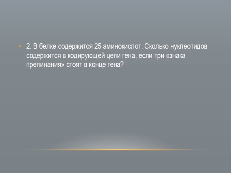 Слайд 192. В белке содержится 25 аминокислот. Сколько нуклеотидов содержится в кодирующей