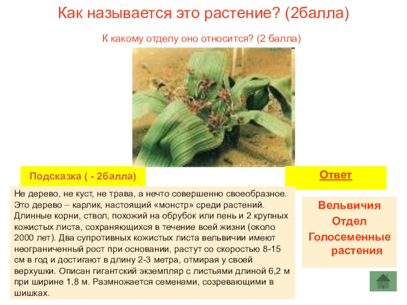 Не дерево, не куст, не трава, а нечто совершенно своеобразное. Это дерево – карлик, настоящий «монстр» среди растений. Длинные корни, ствол, похожий на обрубок или пень и 2 крупных кожистых листа, сохраняющихся в течение всей жизни (около 2000 лет). Два супротивных кожистых листа вельвичии имеют неограниченный рост при основании, растут со скоростью 8-15 см в год и достигают в длину 2-3 метра, отмирая у своей верхушки. Описан гигантский экземпляр с листьями длиной 6,2 м при ширине 1,8 м. Размножается семенами, созревающими в шишках.