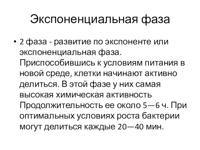 2 фаза - развитие по экспоненте или экспоненциальная фаза. Приспособившись