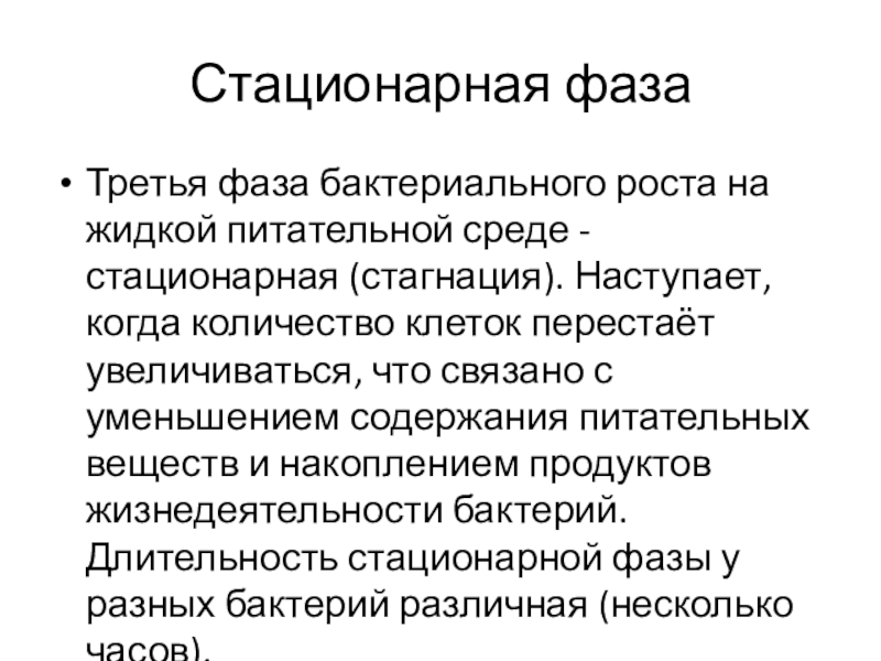 (стагнация). Наступает, когда количество клеток перестаёт увеличиваться, что связано с уменьшением содержания питательных веществ и накоплением продуктов жизнедеятельности бактерий. Длительность стационарной фазы у разных бактерий различная (несколько часов).