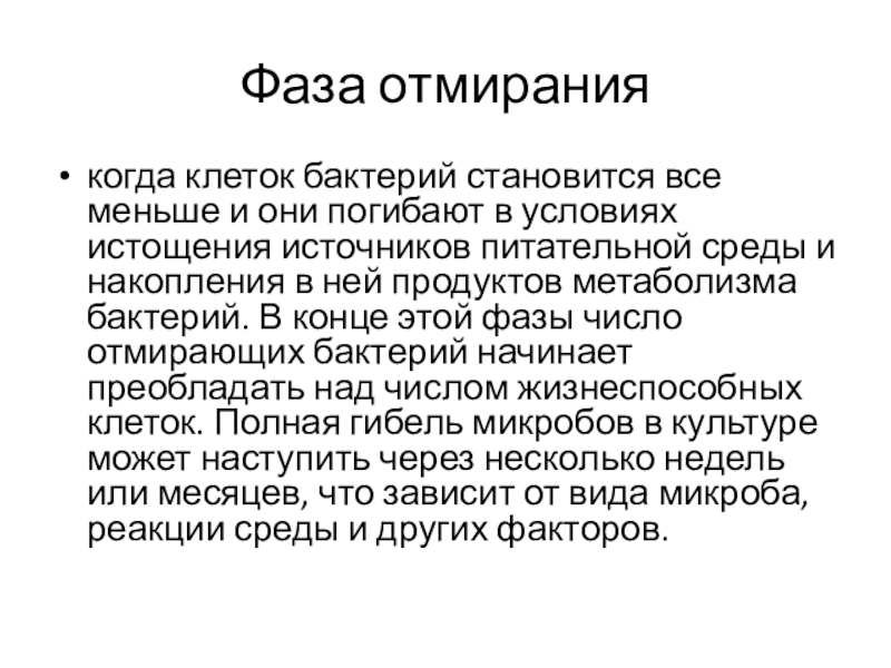 условиях истощения источников питательной среды и накопления в ней продуктов метаболизма бактерий. В конце этой фазы число отмирающих бактерий начинает преобладать над числом жизнеспособных клеток. Полная гибель микробов в культуре может наступить через несколько недель или месяцев, что зависит от вида микроба, реакции среды и других факторов.