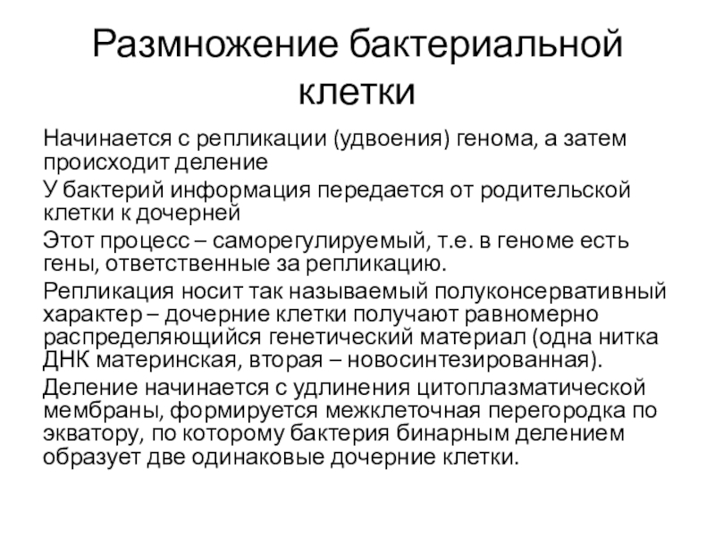 Деление начинается с удлинения цитоплазматической мембраны, формируется межклеточная перегородка по экватору, по которому бактерия бинарным делением образует две одинаковые дочерние клетки.