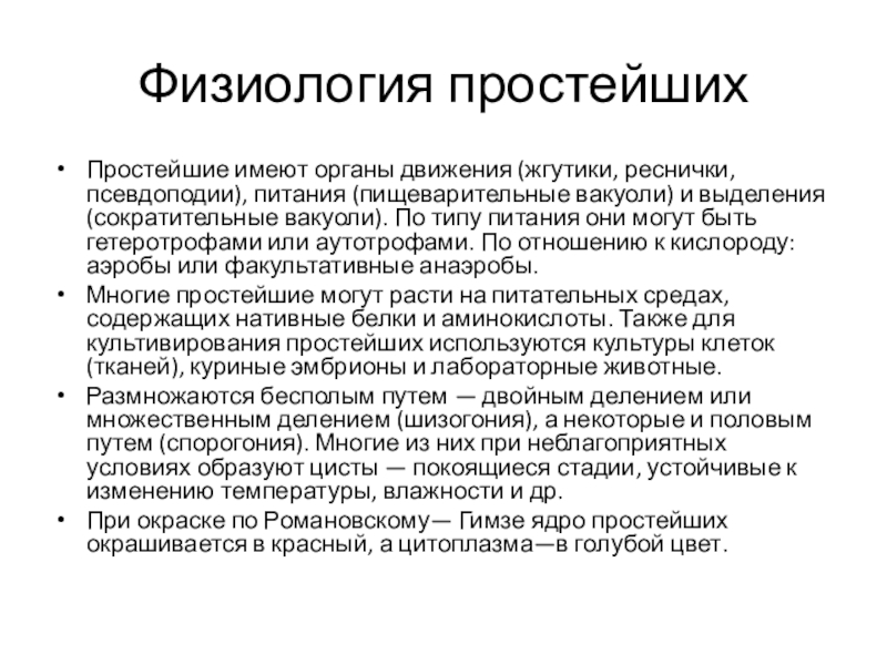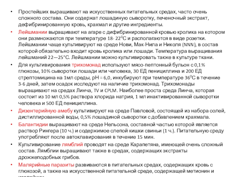 Слайд 14Простейших выращивают на искусственных питательных средах, часто очень сложного состава. Они