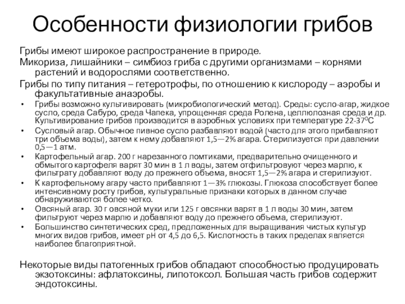 Большинство синтетических сред, предложенных для выращивания чистых культур многих видов грибов, имеет pH от 4,5 до 6,5. Кислотность в таких пределах является наиболее благоприятной.