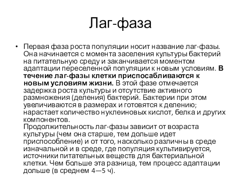 заселения культуры бактерий на питательную среду и заканчивается моментом адаптации переселенной популяции к новым условиям. В течение лаг-фазы клетки приспосабливаются к новым условиям жизни. В этой фазе отмечается задержка роста культуры и отсутствие активного размножения (деления) бактерий. Бактерии при этом увеличиваются в размерах и готовятся к делению; нарастает количество нуклеиновых кислот, белка и других компонентов.