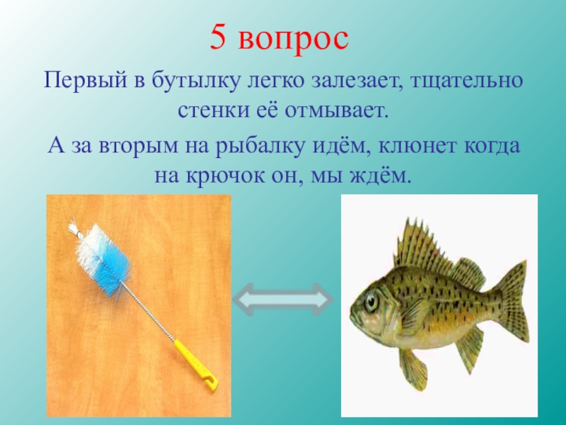 5 вопросПервый в бутылку легко залезает, тщательно стенки её отмывает.А за вторым на рыбалку идём, клюнет когда
