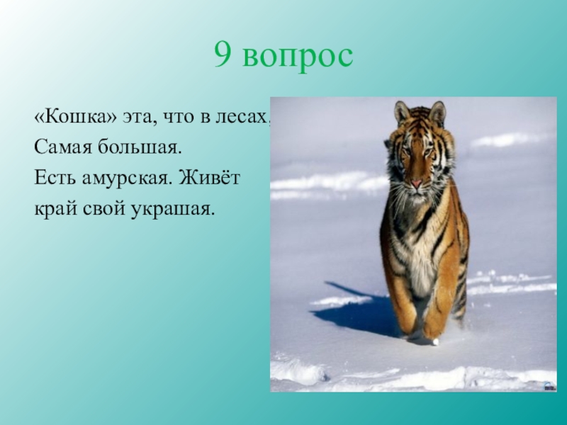 9 вопрос«Кошка» эта, что в лесах,Самая большая.Есть амурская. Живёт край свой украшая.