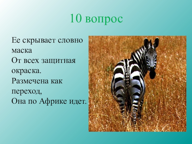 10 вопросЕе скрывает словно маскаОт всех защитная окраска.Размечена как переход, Она по Африке идет.
