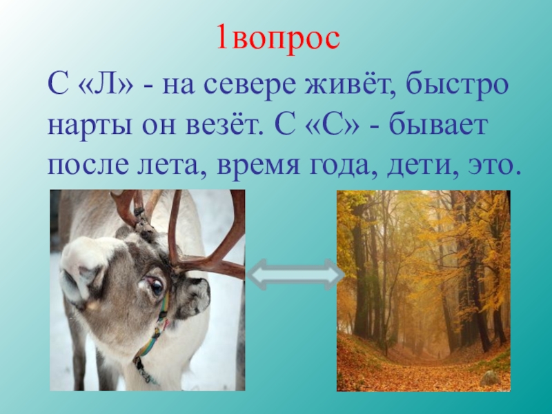 1вопросС «Л» - на севере живёт, быстро нарты он везёт. С «С» - бывает после лета, время