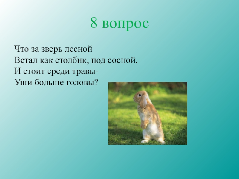 8 вопросЧто за зверь леснойВстал как столбик, под сосной.И стоит среди травы-Уши больше головы?