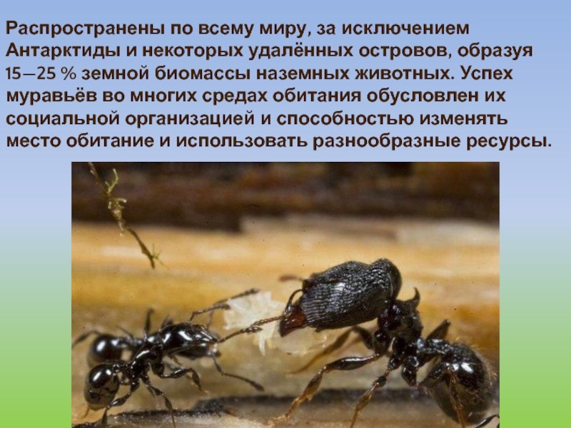 образуя 15—25 % земной биомассы наземных животных. Успех муравьёв во многих средах обитания обусловлен их социальной организацией и способностью изменять место обитание и использовать разнообразные ресурсы.